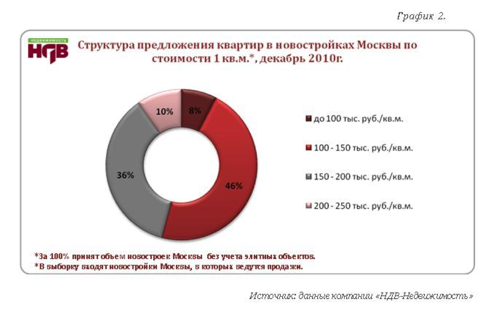 Москва город дорогой. От того покупка в нем дешевых вещей становится настоящим искусством. Особенно досконально данным искусством надо владеть, когда речь идет о приобретении столь необходимого товара как жилье. Последнее на первичном рынке недвижимости столицы может считаться дешевым лишь при цене менее 100 тыс. рублей за кв. метр. В общей структуре предложения на данные новостройки приходится 6-10%. Например, в декабре 2010 структура предложения квартир в новостройках г. Москвы выглядела по данным компании НДВ-Недвижимость следующим образом: