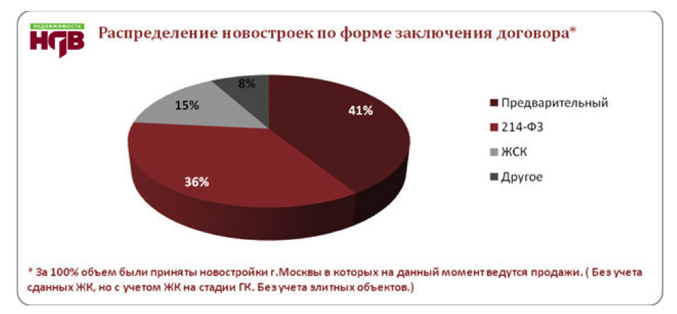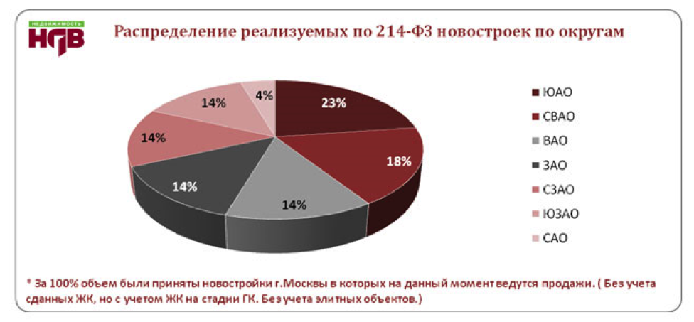 Еще одним фактором, существенно влияющим на стоимость новостройки, является степень готовности, на которой она реализуется. Вполне понятно, что зачастую самое дешевое жилье продается на стадии котлована. Наиболее безопасно приобретать данную недвижимость на основании закона 214-ФЗ. Таковой в Москве 36% от общего количества предложений на первичном рынке жилья. Для сравнения по Предварительному договору купли-продажи продается 41% нового жилья. Более детально с распределением новостроек по форме заключения договора, а так же распределением по округам новостроек реализуемых по 214-ФЗ можно узнать из следующих диаграмм составленных компанией НДВ-Недвижимость.