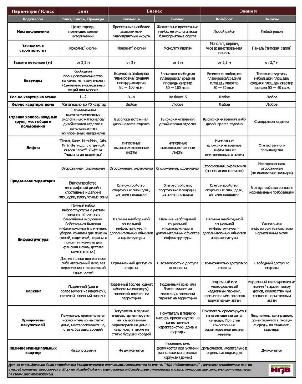 Как видим в данном случае на низкие цены позволяет надеяться лишь каждый десятый новый дом в Москве. Для еще более детального представления нового дома могущего обладать минимальной стоимостью жилья приведем нижеследующую таблицу классификации жилья составленную НДВ-Недвижимость. Желающим приобрести наиболее дешевое жилье стоит обратить внимание на факторы указанные в крайне правой колонке вобравшей в себя характеристики жилья эконом класса в Москве.
