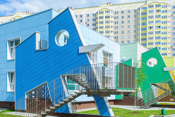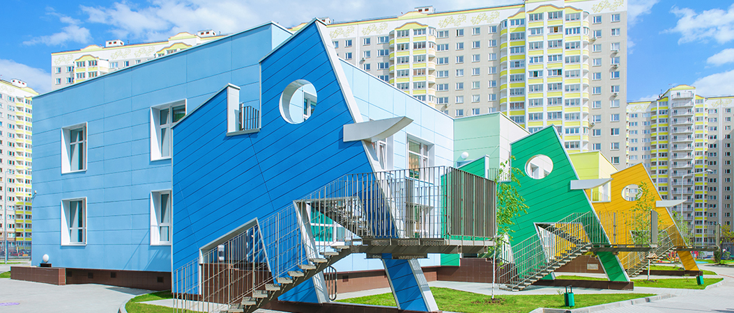 Здания привлекают внимание разнообразием фасадных решений и оригинальным оформлением просторных входных групп. Всего будет построено более 60 корпусов. Запланировано несколько очередей работ, первые шесть фаз уже построены и введены в эксплуатацию.