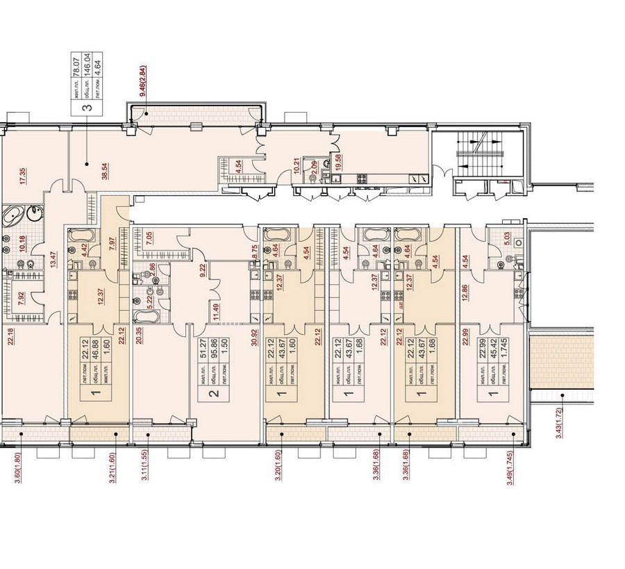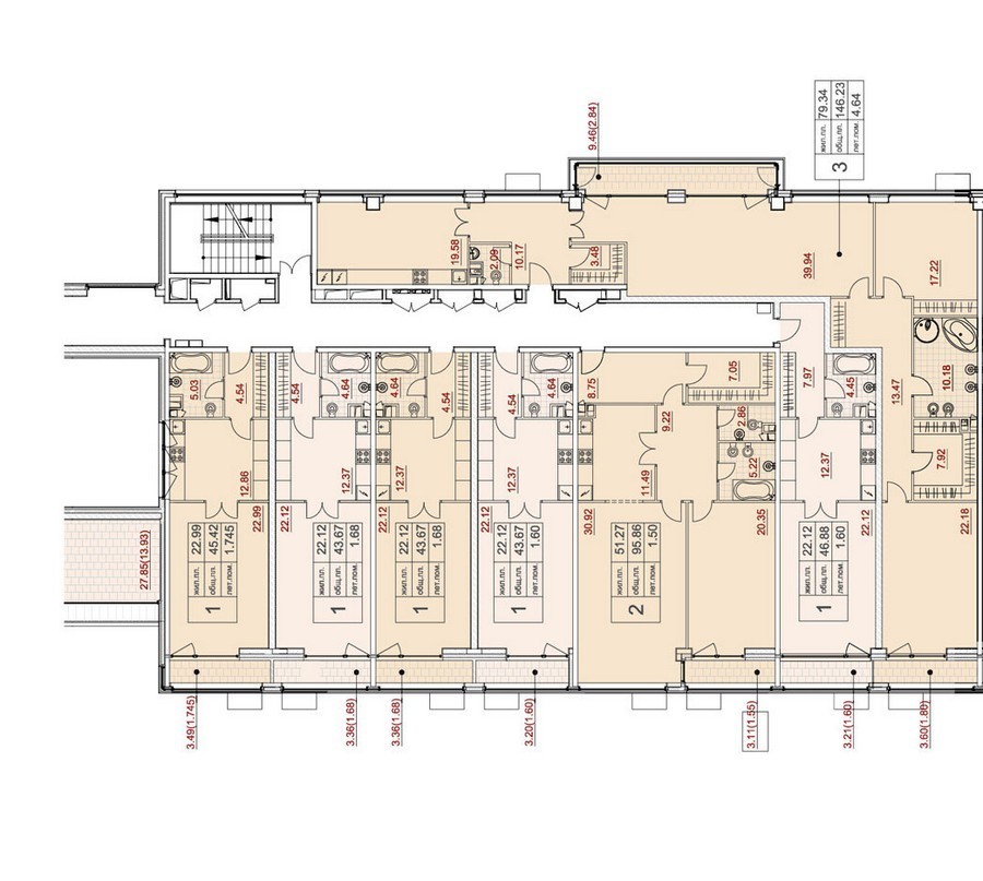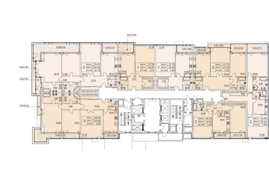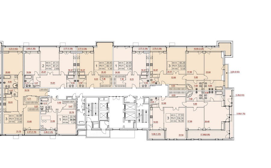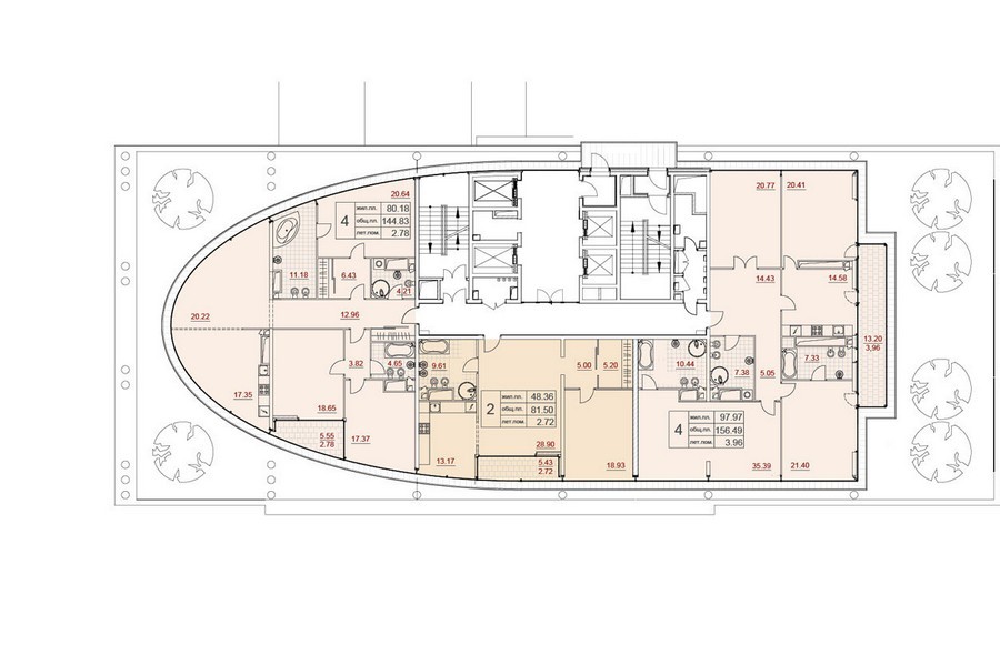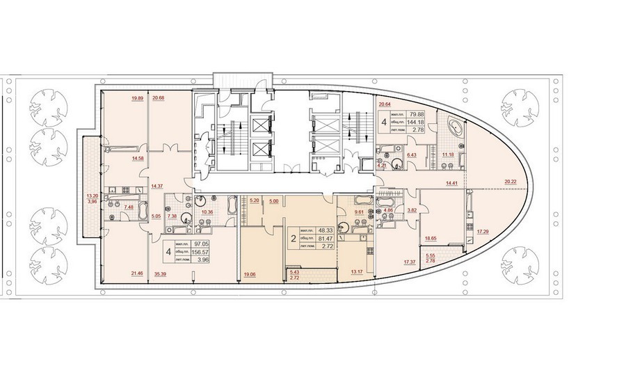 Первые два этажа здания – нежилые. В боковой секции («Б») на первом этаже планируются помещения под офисы. В центральном корпусе («В») будут представлены фитнес-зал, оздоровительный центр, бассейн и ресторан. Несущие конструкции новостройки произведены из железобетона, стены оформлены кирпичом и блоками из ячеистого бетона.