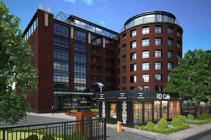 Красивый БЦ, стильное современное оформление и внутри, и снаружи. Приятный дворик внутри, можно попить кофе и придаться другим маленьким порокам офисных работников)) Отдельный плюс — набережная недалеко от БЦ, можно прогуляться в хорошую погоду