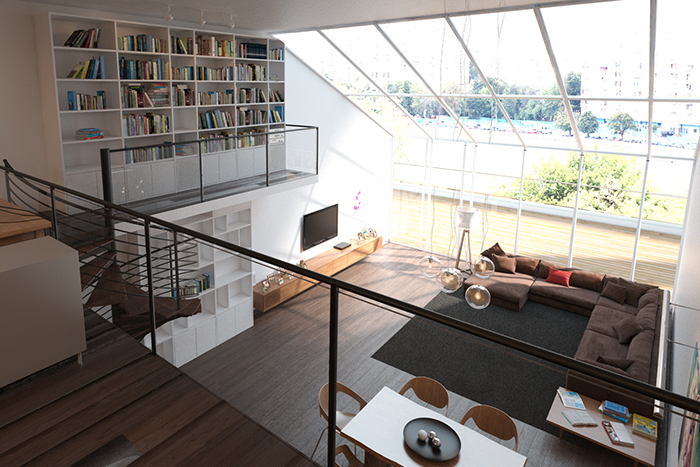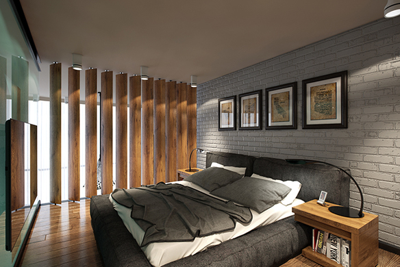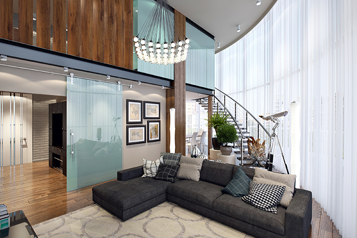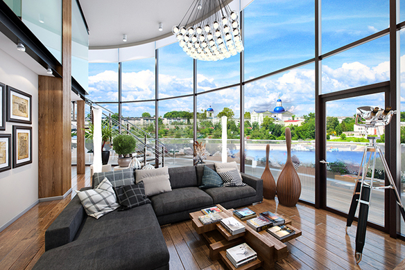 Апартаменты находятся на верхнем этаже в мультифункциональном комплексе «RiverDale», расположенном рядом с Павелецкой набережной. Восьмиэтажное здание выдержано в стиле «лофт» - стены из красного кирпича, панорамные окна, использование в отделке деревянных элементов.