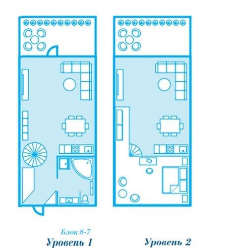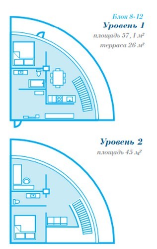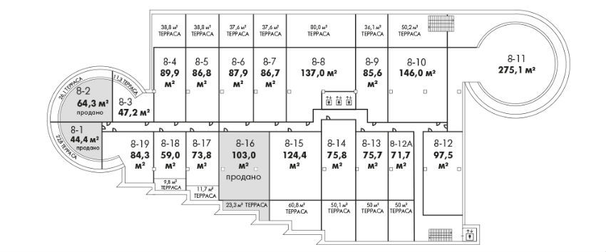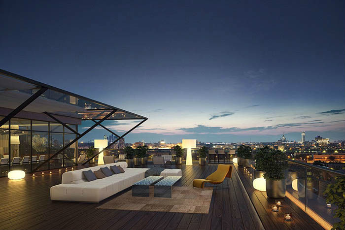Всего в комплексе 45 апартамент площадью от 72 до 120 кв. метров, все они имеют свободную планировку, собственный выход на эксплуатируемую крышу и террасы размером от 23 до 80 кв. метров. Продаются апартаменты застройщиком без внутренней отделки.