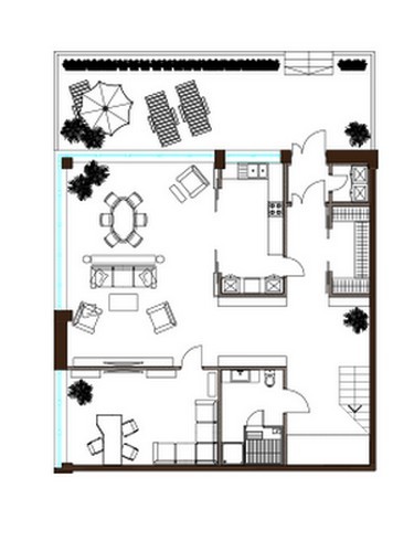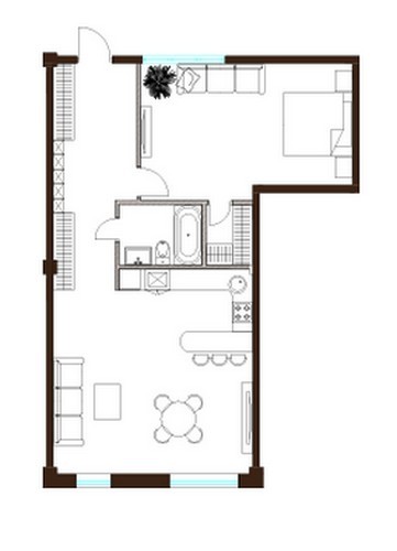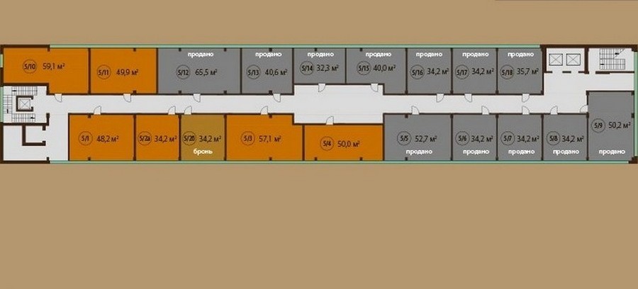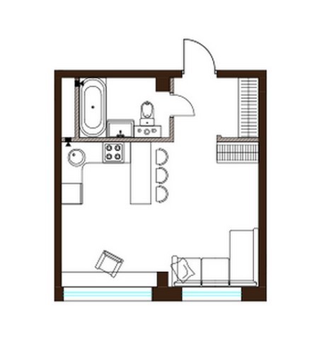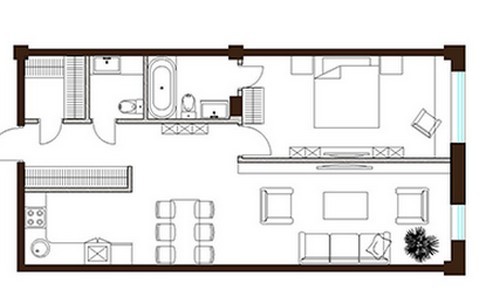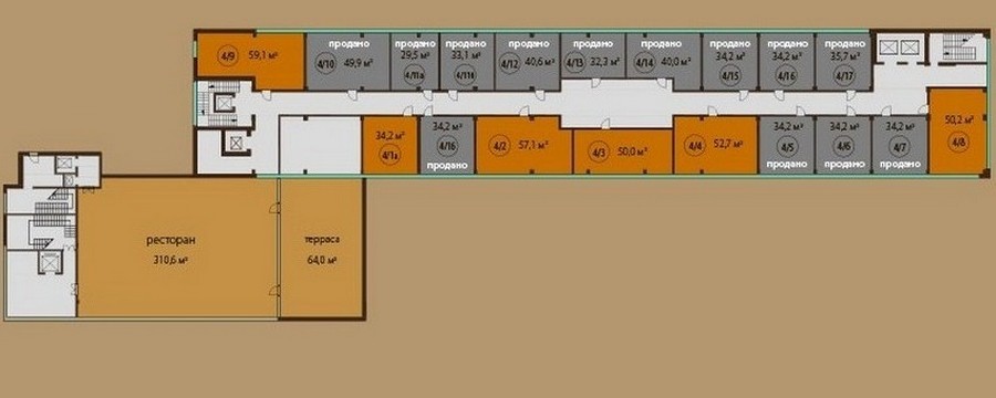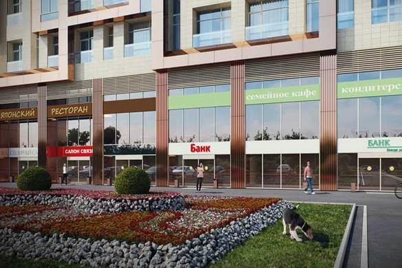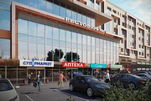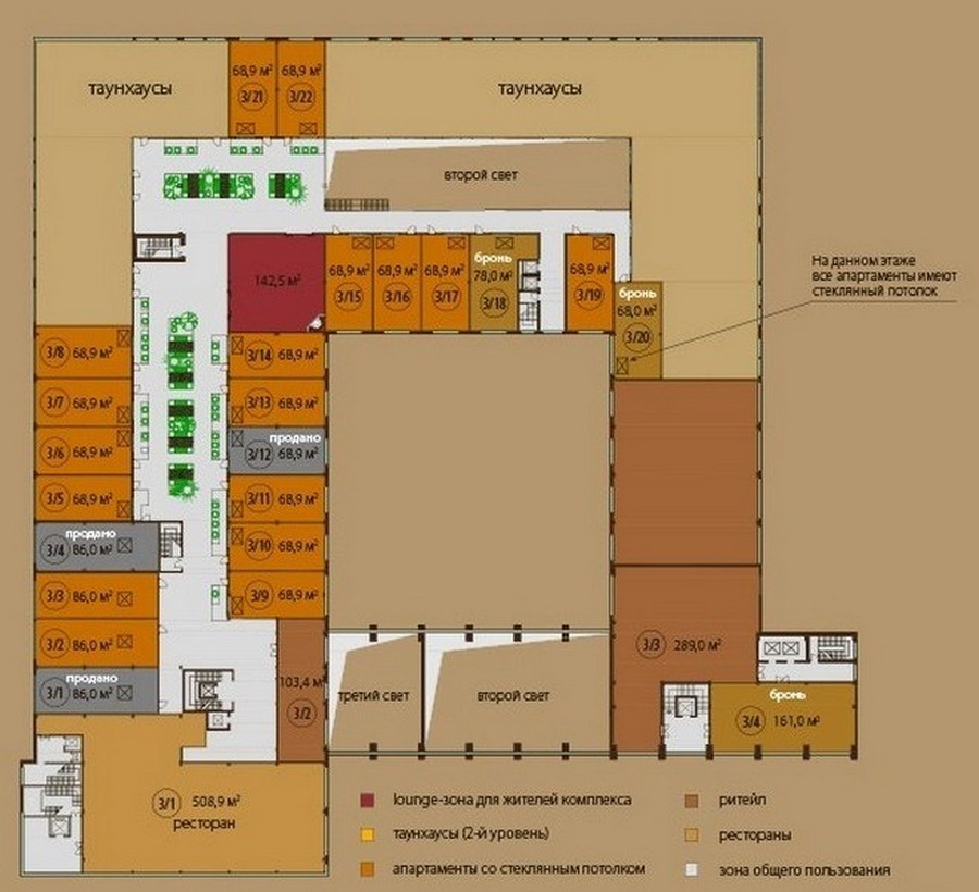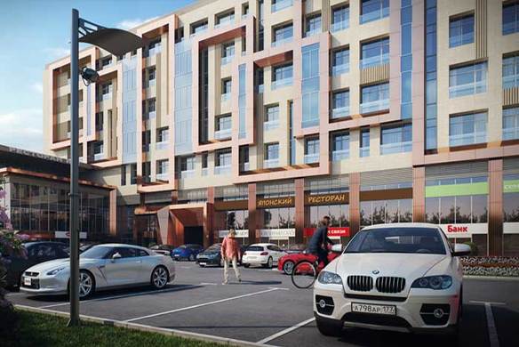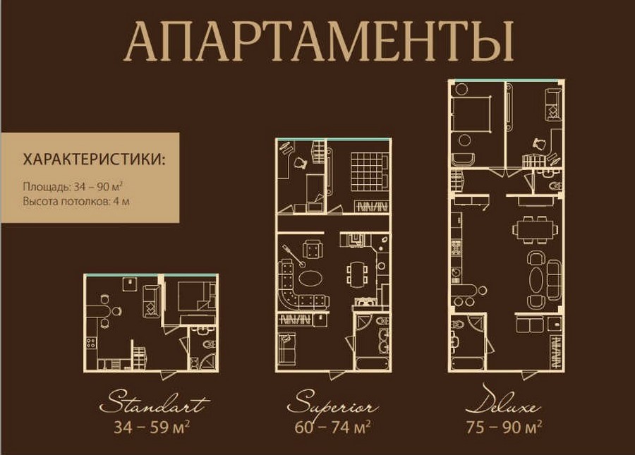 - Апартаменты в 8-этажном доме. Площадь варьируется от 35 до 54 кв. метров, высота потолков составляет 4,5 метра. Апартаменты первых этажей имеют выход на собственные террасы