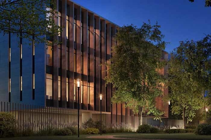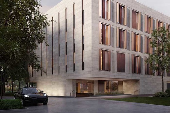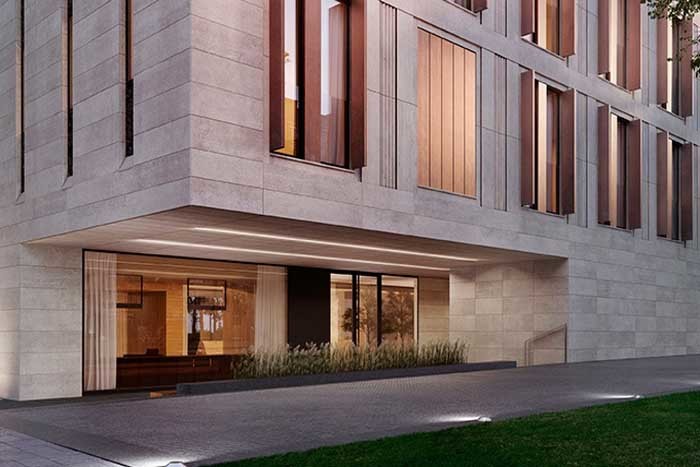 Проект четырехэтажного здания разработан известными архитекторами — строгий стиль минимализма, панорамные окна, природные материалы в отделке фасадов позволили ему идеально вписаться в окружающую застройку.