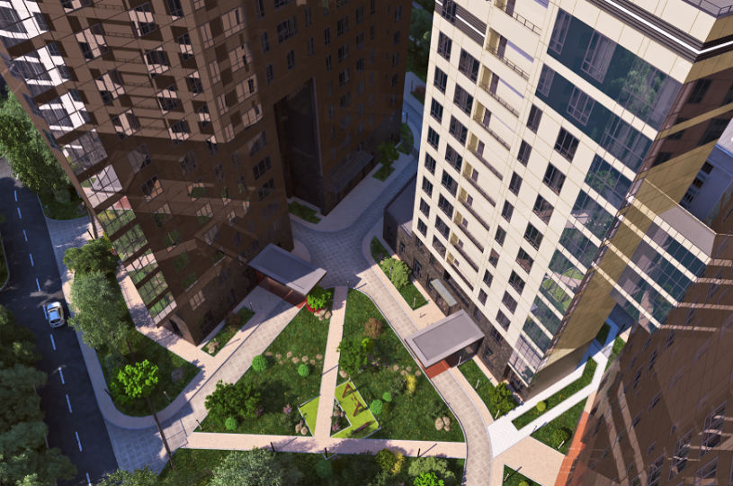 Здесь придерживаются концепции «двор без машин». На территории будут обустроены детские и спортивные площадки. Проведут озеленение и установят малые архитектурные формы. Комплекс сделают огороженным и охраняемым.