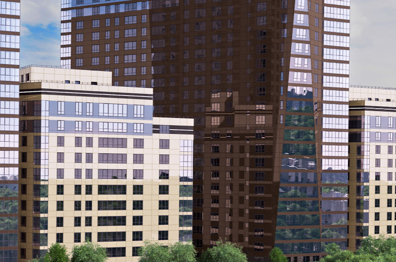 Интересное архитектурное решение — расширение корпусов, обретающих за счет этого трапециевидную форму, по мере увеличения высоты. Поэтому чем выше этаж, тем больше площадь располагающихся на нем квартир.