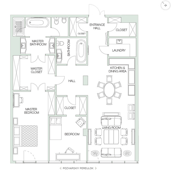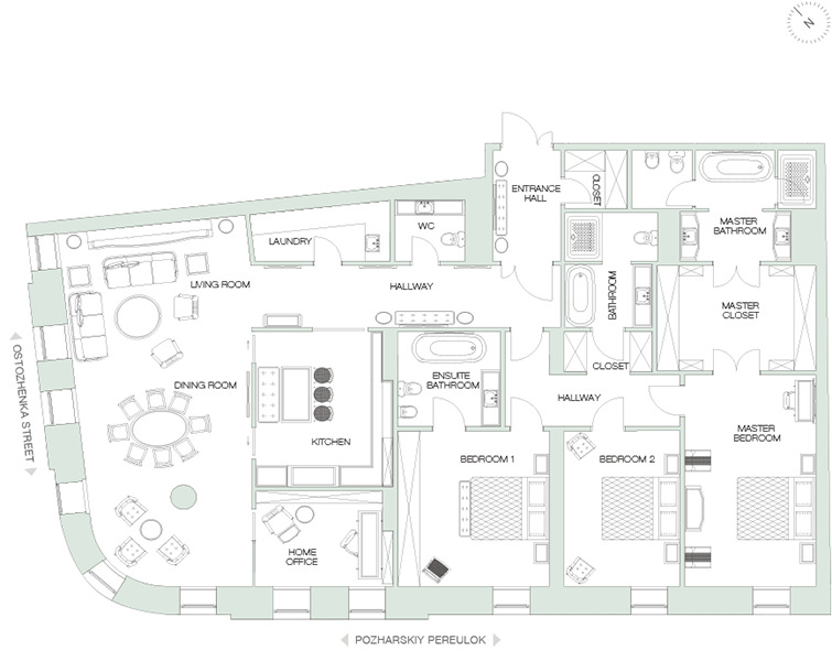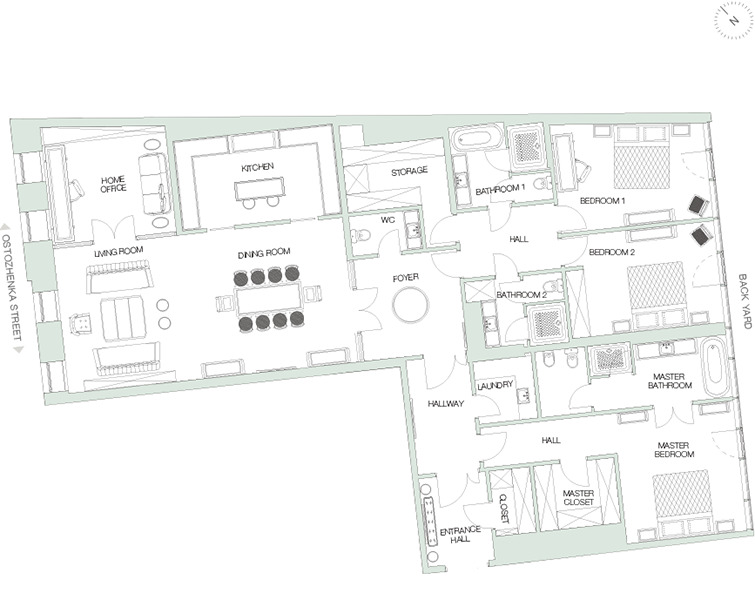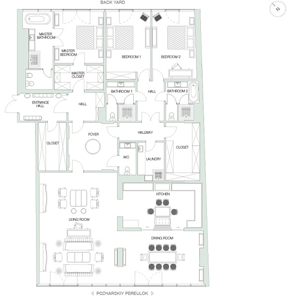 Над обустройством же внутреннего двора поработали специалисты по ландшафтному дизайну — высаженные деревья ценных пород, изысканные газоны и клумбы превратили его в настояший миниатюрный парк.