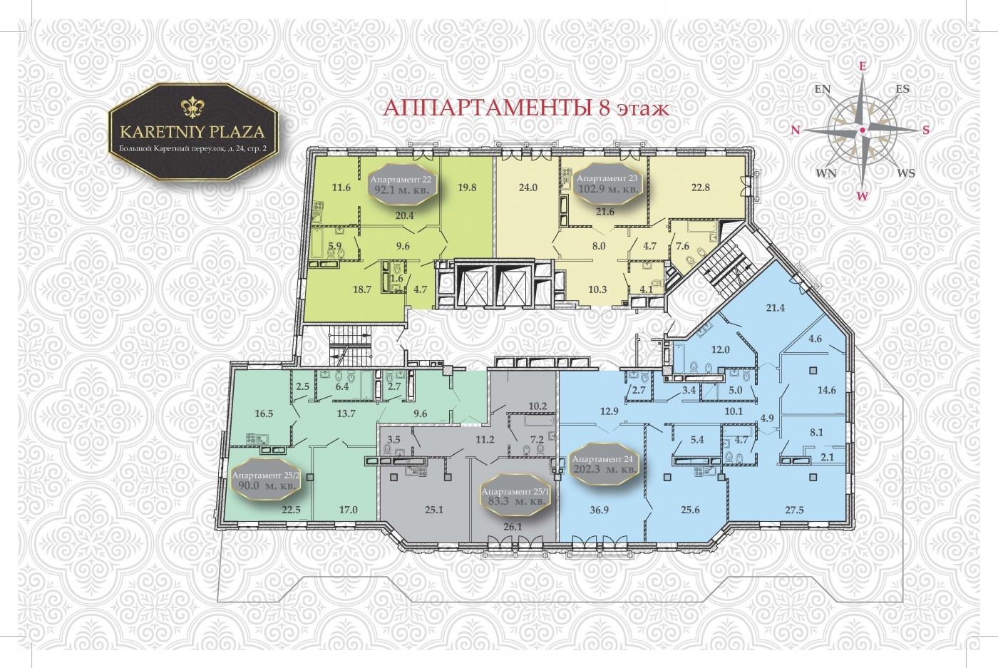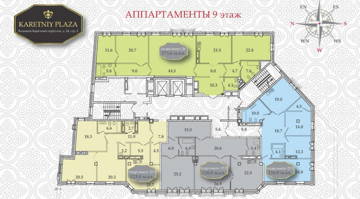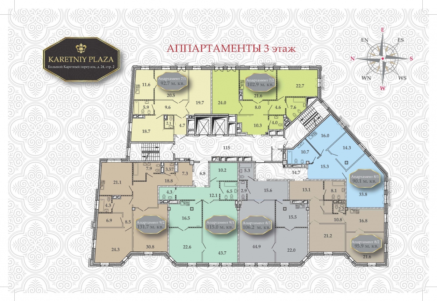 Всего в новостройке «Каретный плаза» 26 квартир и каждая из них заслуживает внимания. Квартиры имеют от одной до пяти комнат, общая площадь их варьирует от 59 до 392 кв. метров. Верхние этажи занимают два пентхауса..