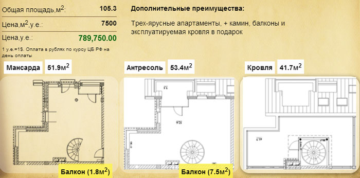 Самые большие трехуровневые апартаменты в двух вариантах 105 (26,85 млн. руб.) и 115,6 кв. метров (27,5 млн. руб.) продаются по акции. Стоимость квадратного метра здесь сложно вычленить, т.к. в расчет берутся только 1 и 2 этажи (мансарда и антресоль в терминологии застройщика), а два балкона (общей площадью около 10 кв.м) и эксплуатируемая кровля (больше 40 квадратов) как будто бы дарятся. В наличии есть трехуровневые апартаменты и поскромнее - 86,3 и 96,3 кв. метров.