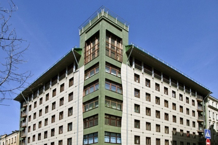 Семиэтажное монолитное здание выстроено по авторскому проекту и привлекает внимание яркими трехцветными фасадами, необычной конфигурацией и богатым декором входной группы.