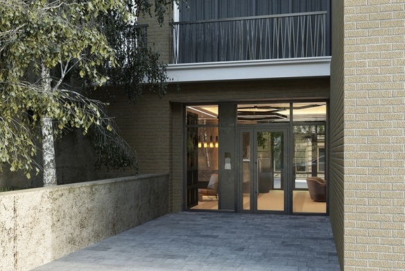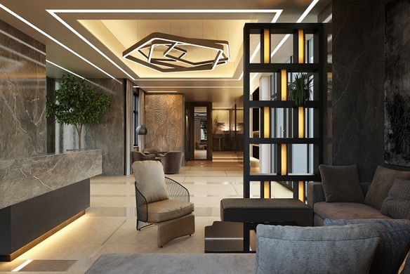Входная группа с отделкой из натурального камня и дерева вмешает просторное лобби, прекрасно подходящее для ожидания гостей и деловых переговоров, а также помещение для консьержа.