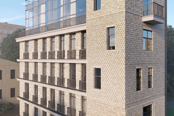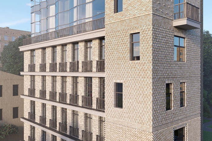 Семиэтажное здание выдержано с лаконичном современном стиле, привлекая внимание фасадами с художественной кирпичной кладкой, изящными ограждениями балконов, панорамными окнами необычной формы.