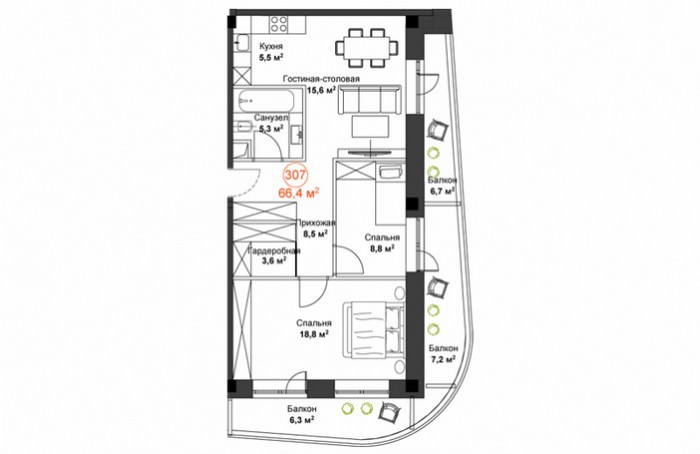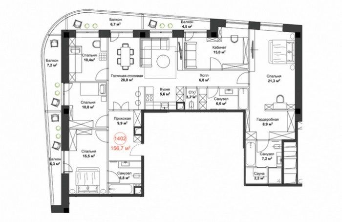 Всего застройщиком предлагается 56 апартаментов — они располагаются со 2 по 17 этажи. Площади начинаются от 60 кв. м. до 156,7 кв. м., высота потолков составляет 3,15 метра. Все апартаменты в охраняемом Клубном доме на ВДНХ свободной планировки, соседние можно объединять до получения желаемой площади.