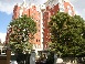Девятиэтажное здание выстроено по индивидуальному проекту, привлекая внимание яркими кирпично-белыми фасадами с декором, облицовкой из натурального камня, элементами сплошного остекления и необычной конфигурацией.