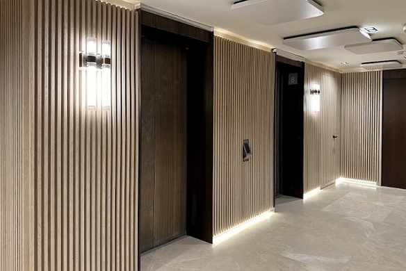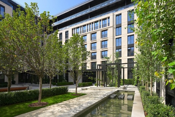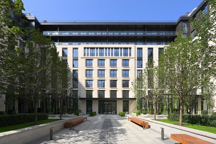 Расположившееся на закрытой, охраняемой территории восьмиэтажное здание выдержано в строгом классическом стиле, привлекая внимание огромными окнами и сплошным остеклением верхних этажей.