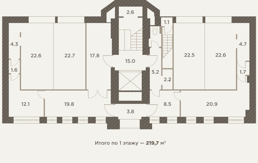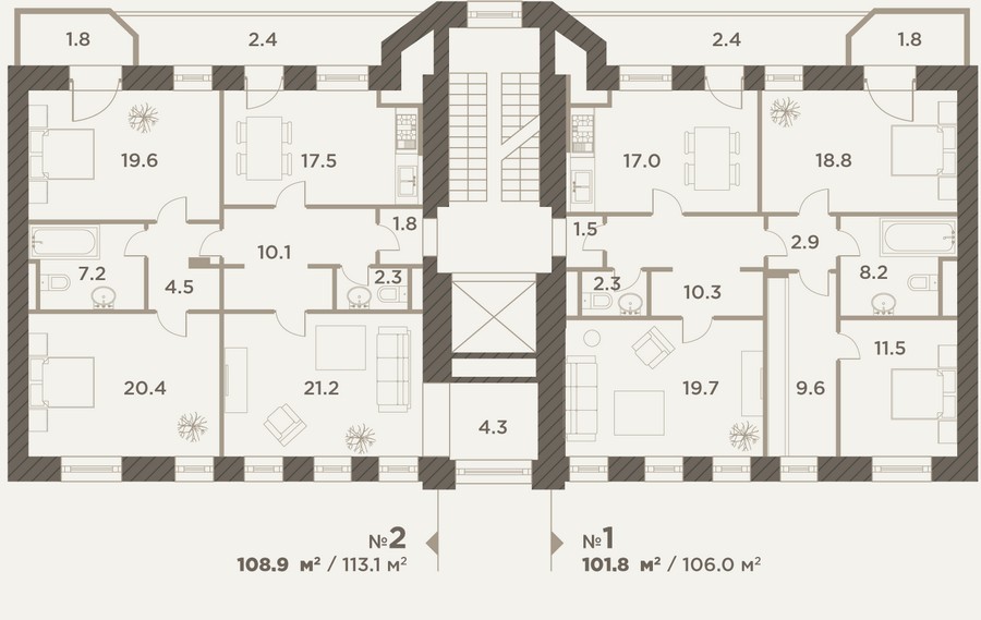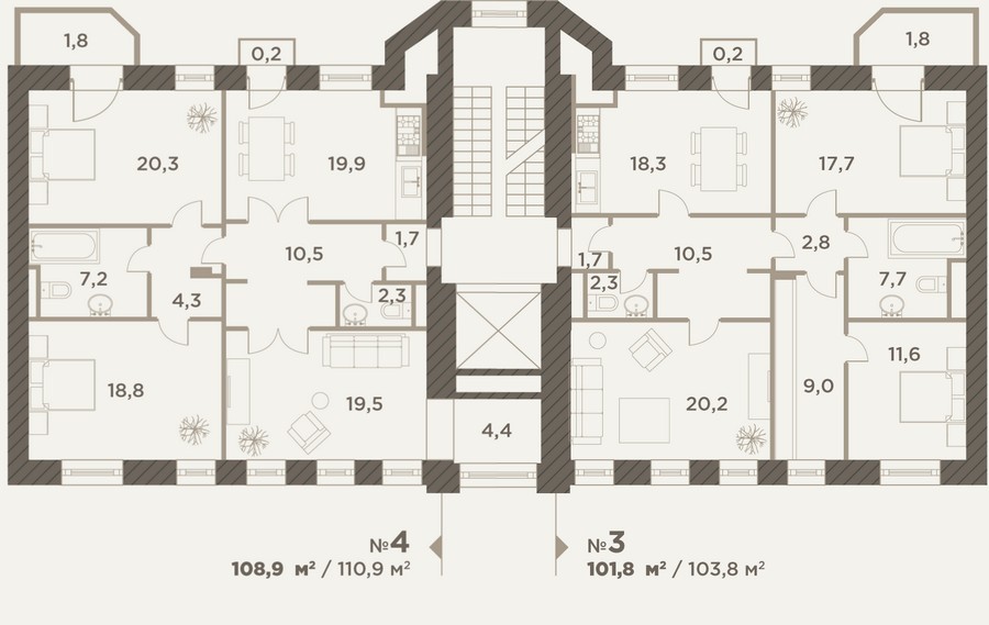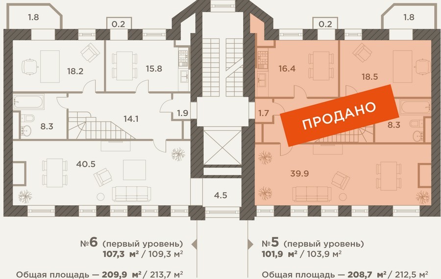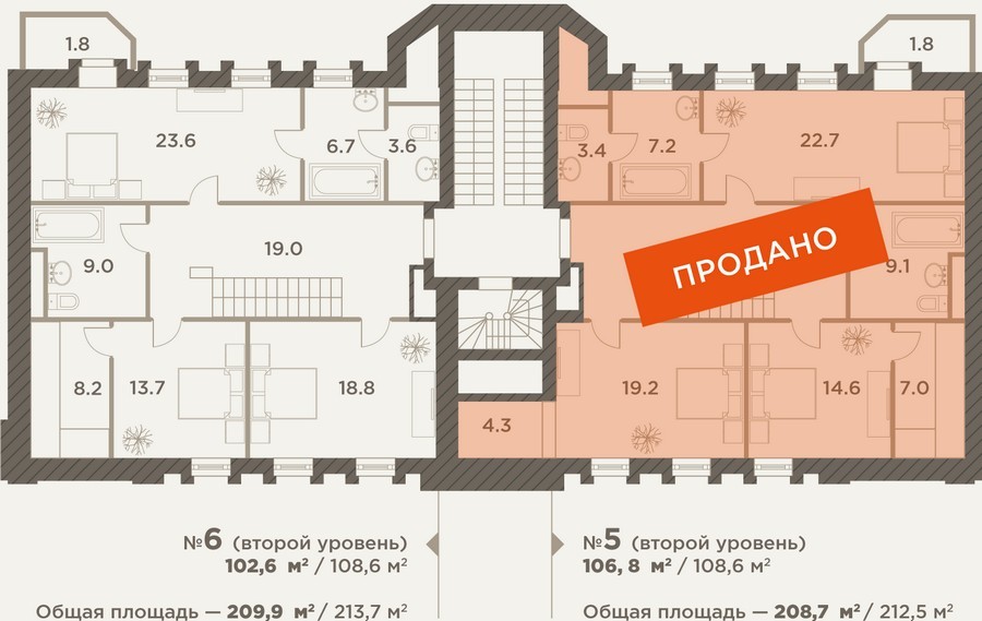 Предлагается всего шесть квартир, площадь самой скромной — 106 кв. метров, высота потолков — 3,3 метра. Квартиры второго этажа имеют большой балкон-террасу, на верхнем этаже расположились двухуровневые квартиры с возможностью установка камина. Сдаются все квартиры подготовленными к чистовой отделке.