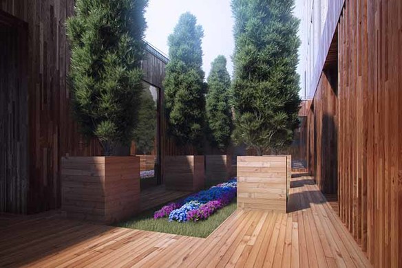 - Закрытый зеленый внутренний двор с пешеходными дорожками и скамьями;