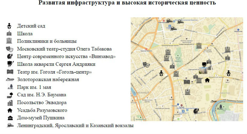 А ведь район обладает всеми особенностями, необходимыми для элитной локации. Это настоящий культурный центр, позволяющий вести особый образ жизни: устраивать пешие и велосипедные прогулки, посещать культовые театральные постановки, выставки, наслаждаться особым духом старой Москвы. Совсем рядом протекает Яуза, набережные которой планируют в будущем благоустроить.