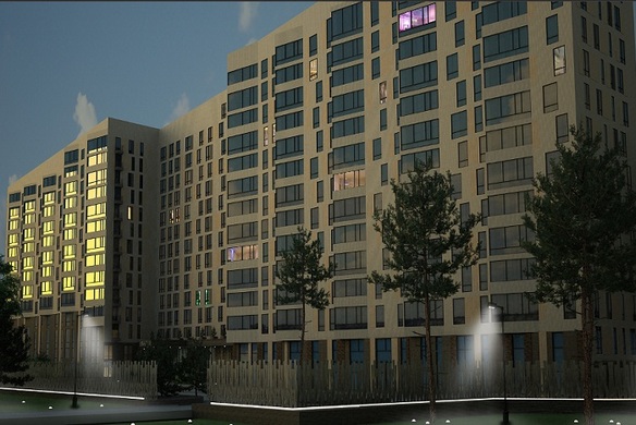 На закрытой территории возводится 14-этажное каркасно-монолитное здание, выдержанное в «экологическом» стиле — панорамные окна, фасады в отделкой «под дерево», просторные светлые входные группы.