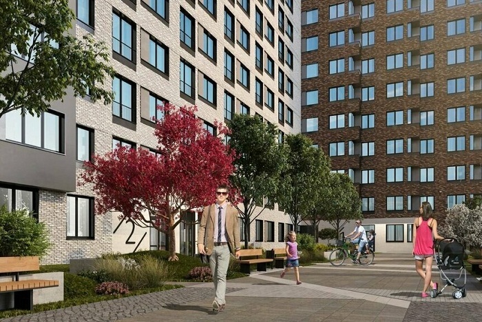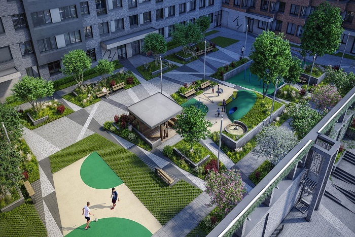 Большое внимание уделяется придомовой территории — там проводится озеленение, прокладываются прогулочные дорожки, оформляются места для отдыха, оборудуются игровые городки для детей и площадки с уличными тренажерами.
