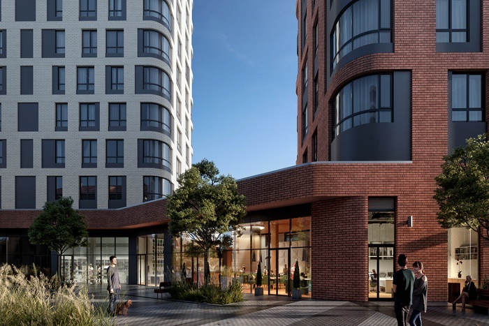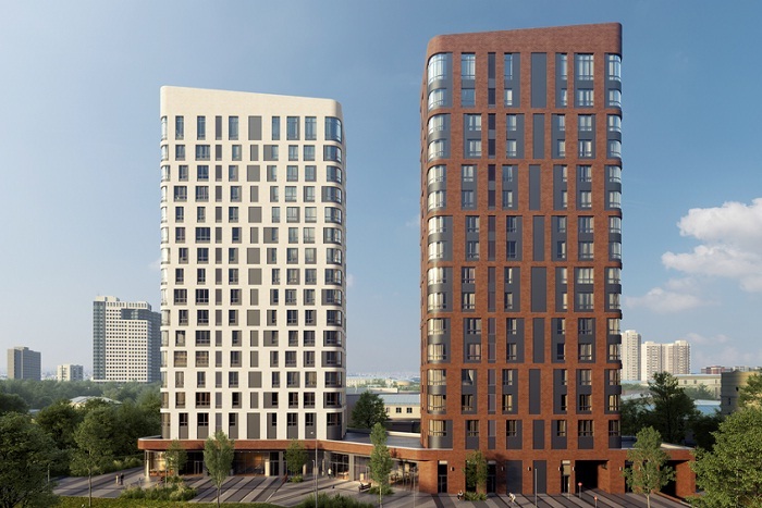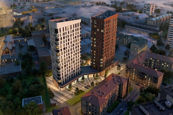 Два 16-этажных здания - «башни» возводятся на общем стилобате, привлекая внимание необычными силуэтами, панорамными окнами и яркими фасадами.