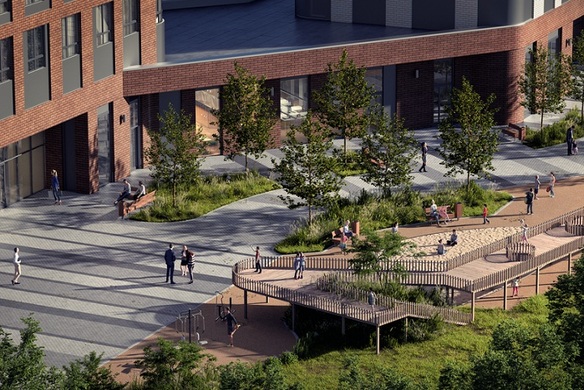 Стилобатная часть комплекса отведена под коммерческие помещения — концепция проекта предполагает развитие внутренней инфраструктуры, в подземном уровне разместится паркинг и кладовые, которые можно приобрести в качестве дополнения к квартире. Закрытая придомовая территория озеленяется и благоустраивается.