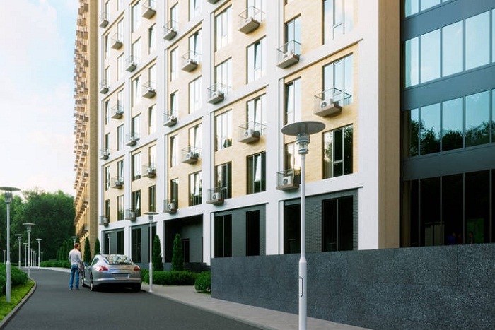 Новый апарт-комплекс — 12-этажное монолитное здание, возводимое по оригинальному проекту и привлекающее внимание светлыми фасадами со стильным декором, необычным силуэтом, панорамными окнами и просторными входными группами.