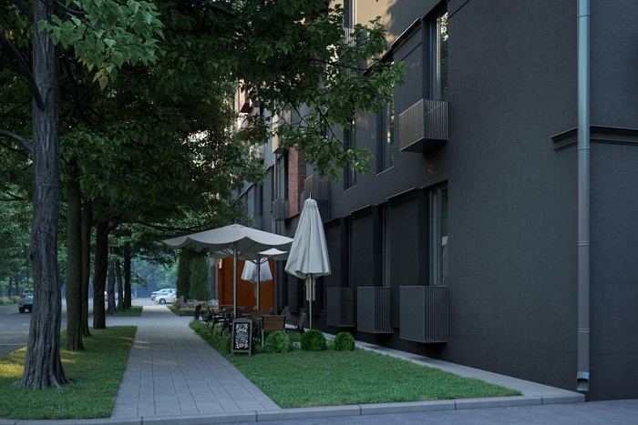 Территория огорожена, работает охрана и консьержи. Оборудуются наземные парковочные места. Цокольный уровень здания отведен под дополнительные помещения-кладовые.
