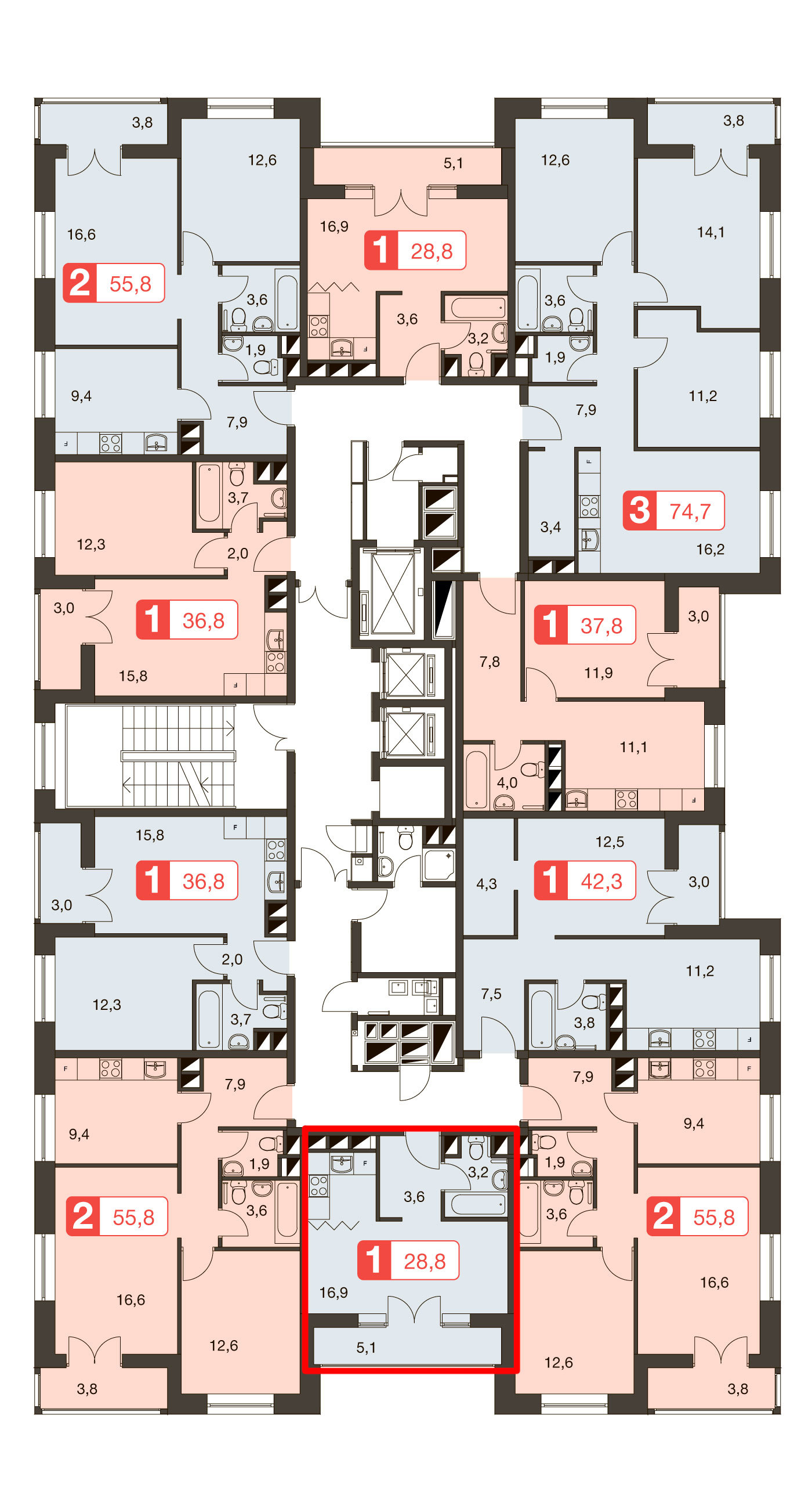 Размер предлагаемых апартаментов варьируется от 29 до 75 кв. метров — от студий до трехкомнатных. Высокие, 3 метра, потолки, большие окна и удобные планировки позволят реализовать практически любой дизайн-проект — апартаменты сдаются без внутренней отделки.