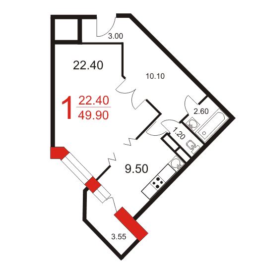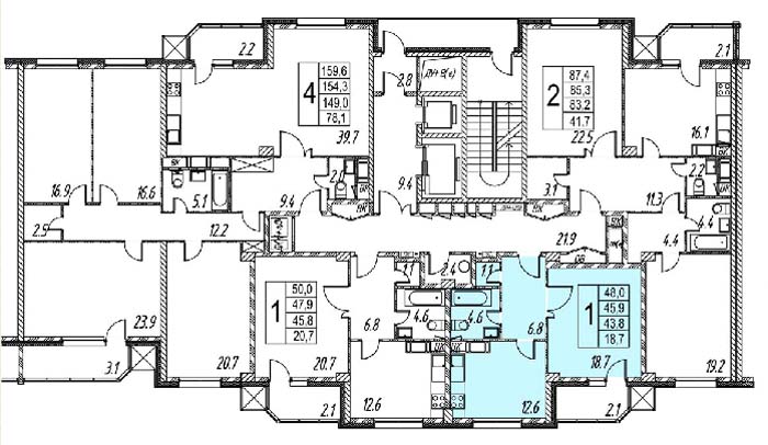 Средняя площадь однокомнатной квартиры составляет 48 метров, имеет типовую планировку, а цена варьируется от 8,7 млн. руб. до 10,3 млн. руб. средняя стоимость м2 от 182 т. Руб.