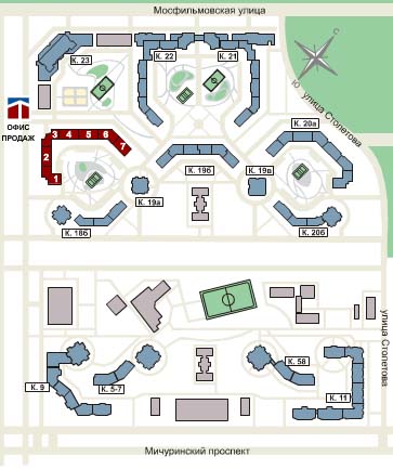 По плану застройки из буклета в проекте еще 7 корпусов, причем в реальности строится 3 корпуса, а в продаже у «Главмосстрой-Недвижимости» только один – это монолитно-кирпичный корпус Мичуринский проспект, 18а. Ведется так же строительство корпуса 9, но на него судя по всему нет пока разрешительных документов, а так же здания, который, по словам продавца, не имеет отношения к данному жилому комплексу. Так вот корпус 18а, несмотря на менее интересный внешний вид и расположение, практически полностью раскуплен.