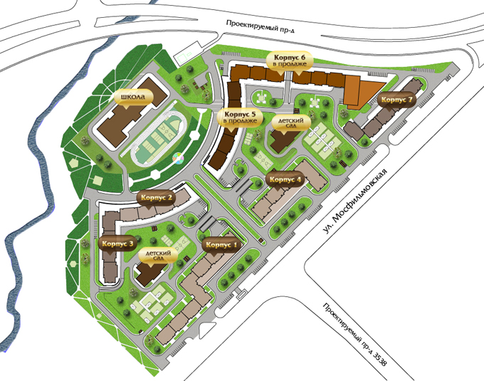 Также я хотела узнать будут ли облагораживать территорию вдоль реки, соединяющую территорию ЖК «Мосфильмовский» и ЖК «Золотые ключи», но в полученном наборе слов не уловила никакого смысла. Более того, вдоль 5 и 6 корпусов планируется возведение эстакады, соединяющей улицы Веерную и Мосфильмовскую (Проектируемый проезд на схеме), когда она будет реализовываться действительно никто не знает наверняка, но хочется надеяться, что она пойдет на достаточном отдалении от домов.