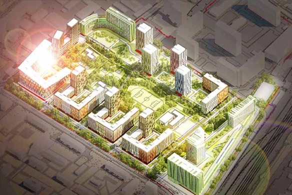 Новый микрорайон займет территорию в 22.5 гектара, которая будет в несколько этапов застроена монолитно-кирпичными зданиями разной высотности (до 36 этажей). Часть из них расположится на общих стилобатах.