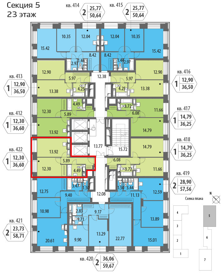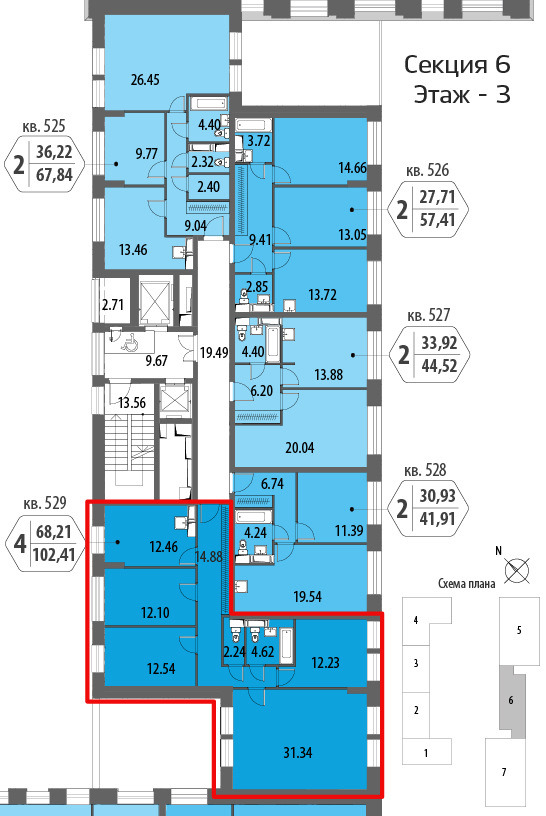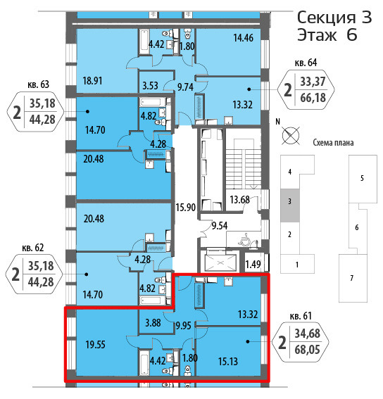 Планировка этажа с 4-комнатной квартире в 9-этажном доме
