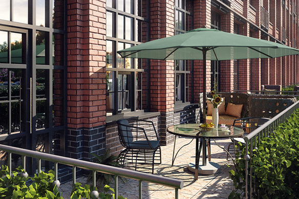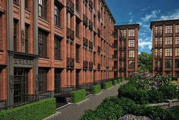 На закрытой территории в окружении зеленого сквера выстроены четыре здания, выдержанных в классическом стиле «лофт» - добротный красный кирпич, панорамные окна, кованые и деревянные элементы в отделке и оригинальная подсветка фасадов. Интересны и дизайнерские решения мест общего пользования, разработанные известным архитектурным бюро.