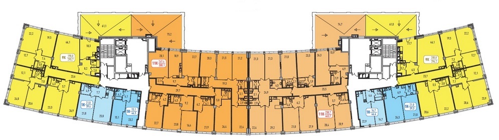 Имеются и эксклюзивные варианты, располагаются они на верхнем этаже — квартиры с девятью и одиннадцатью комнатами площадью до 467 кв. метров.