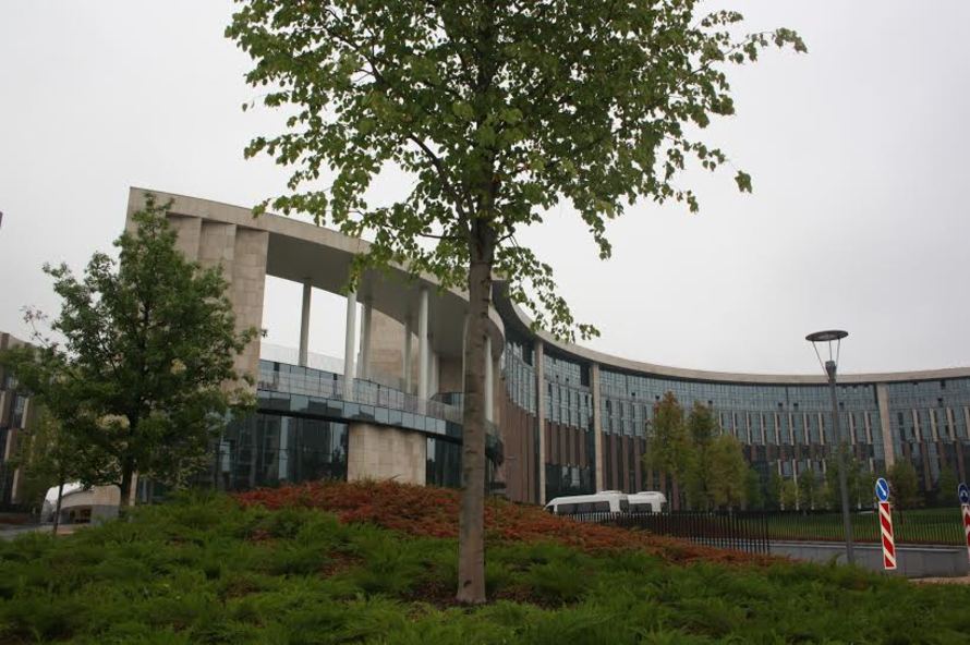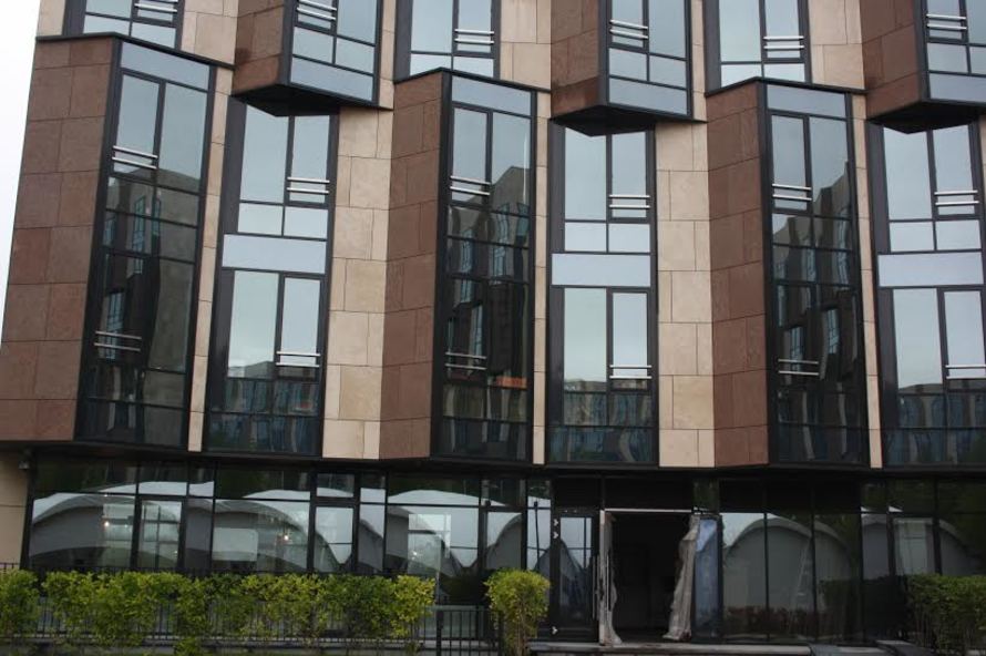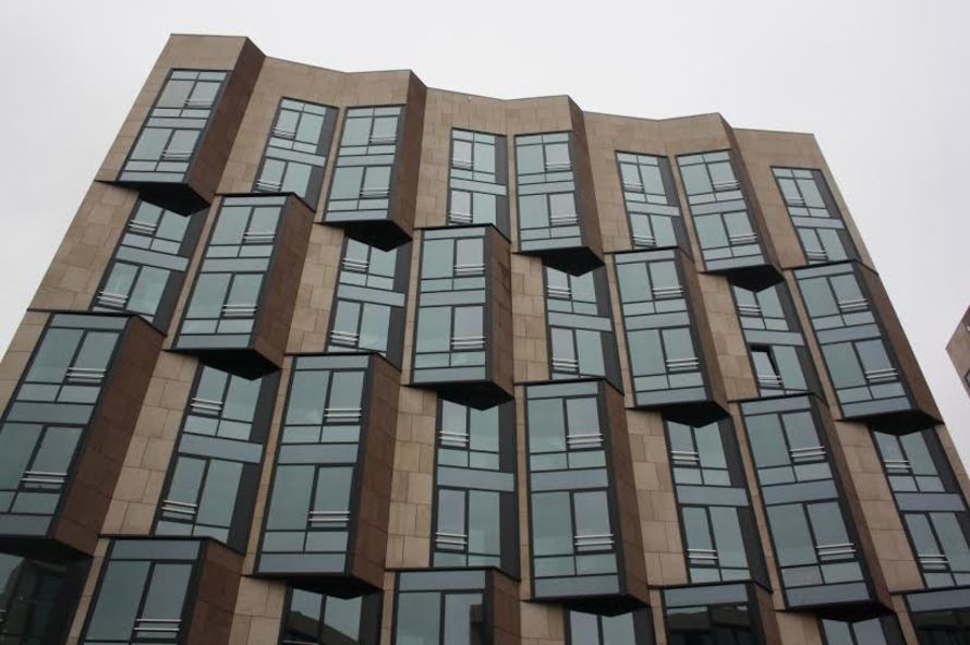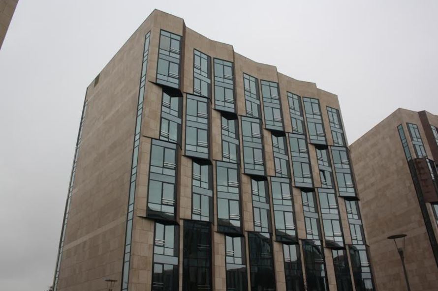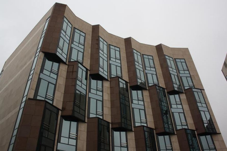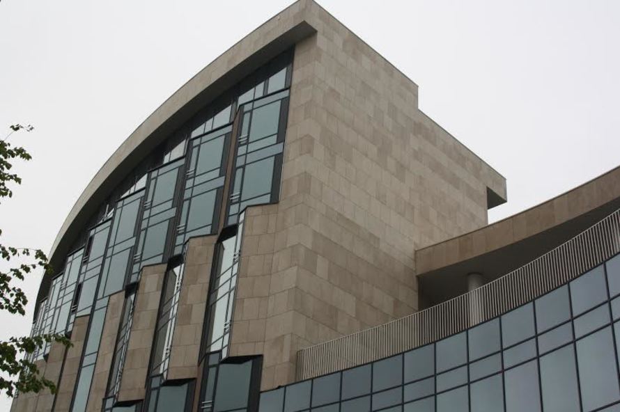 Они здесь монолитно-кирпичные. Стены оборудованы утеплителем толщиной 150 мм. Фасады здания облицованы натуральным юрским мрамором и маульброннским песчаником, создающими приятную внешне текстуру и цветовую гамму, сочетающую в себе светло-коричневый и темно-коричневые цвета. Фасадный камень укрепляется на немецкой алюминиевой системе. Остекление панорамное.