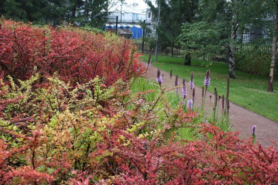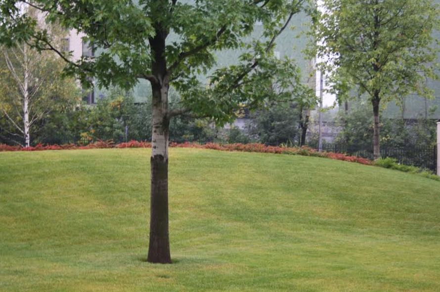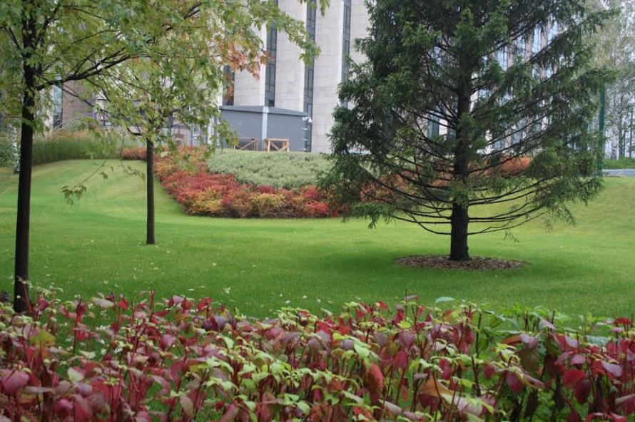 Обустройство ландшафта завораживает — в основе английский парк с масштабными лужайками со сложным рельефом занимающий более 1 Га. Это детище английского бюро «HED». Ландшафтный дизайн всей территории находится на самом высоком уровне — здесь высажено 300 крупномеров и 25 тыс. кустарников, а «мелкие» растения образуют интересную цветовую гамму, которая меняется в течение сезона.