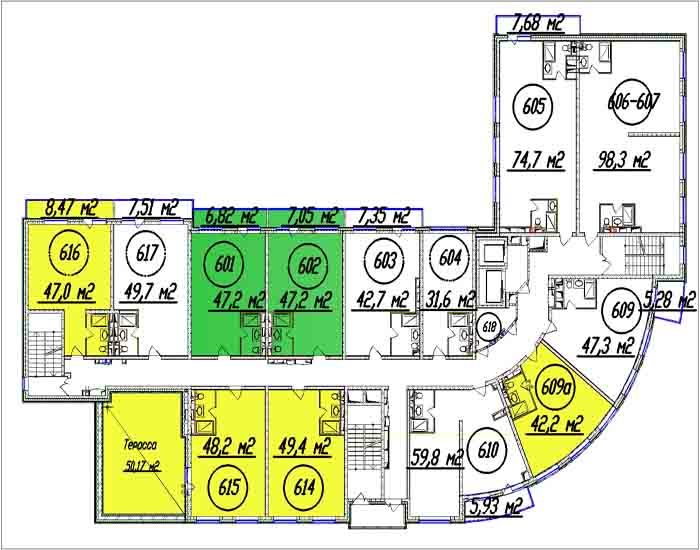 Дом бизнес-класса отличается комфортабельностью, безопасностью проживания и невероятно красивым ландшафтным дизайном. Он представляет собой жилое здание переменной этажности (до 11 этажей). Апартаменты расположены с 3 по 11 этаж, размер их начинается от 46,7 кв. м. до 97,6 кв. м., соседние можно объединять до получения желаемой площади. На первом и втором этаже расположены коммерческие помещения.