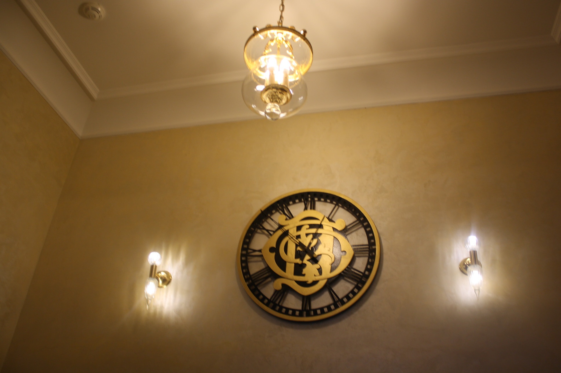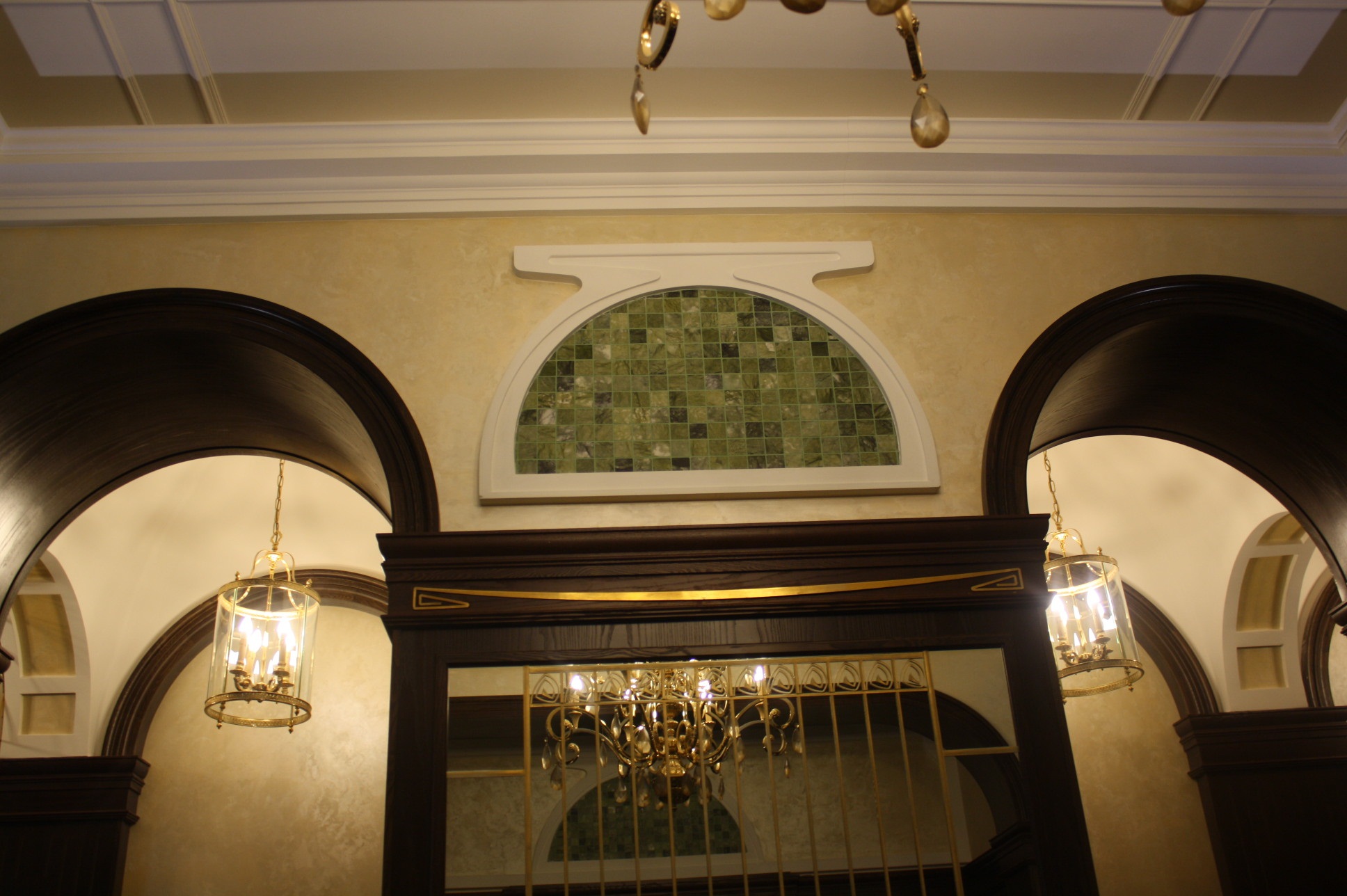Полы во входных группах представляют собой инкрустацию ручной работы из мрамора четырех различных оттенков. Стены облицованы деревянными панелями из шпона ореха и декоративной штукатуркой.