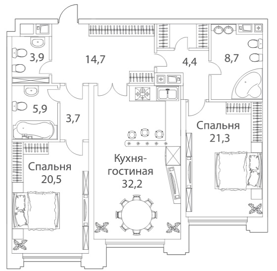 Имеются даже линейные трехкомнатные – как, например, это 155-метровое жилье.