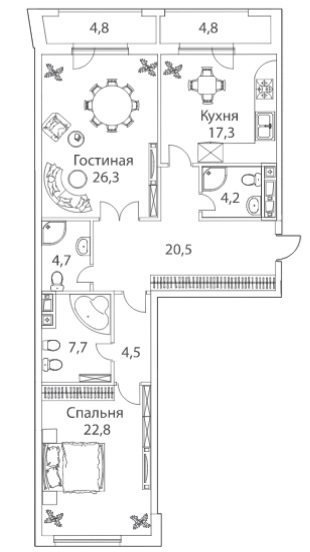 Однако есть и редкие распашные варианты - 116-метровая квартира в форме условной буквы "Г", где в нижней части можно организовать спально-релаксационное, а в верхней — гостинно-кухонное пространство.