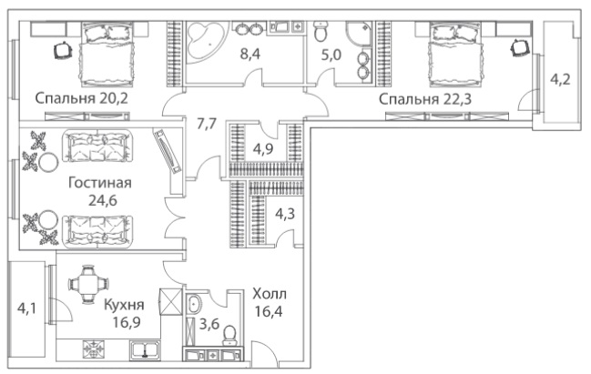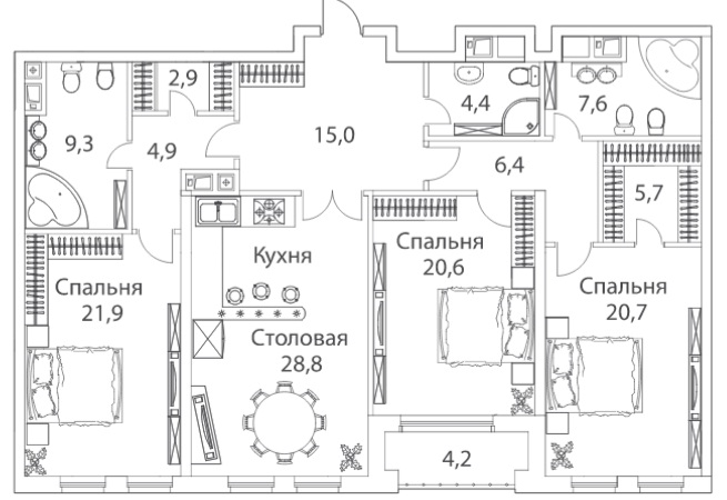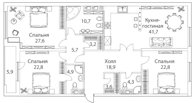 Имеются и трехкомнатные квартиры симметричного плана — как, например, 175-метровое жилье в форме правильного прямоугольника, где можно рационально распределить жилое пространство по равномерному принципу: