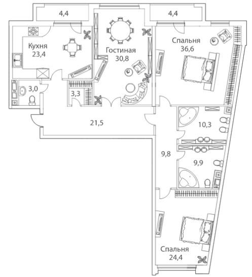 181-метровая трешка имеет очень необычную конфигурацию. Помещения спальной зоны, тоже выделенные в отдельное пространство, с предусмотренными при ними санузлами, обретают специфическую форму.