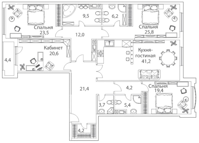 205-метровая четырехкомнатная квартира имеет обзор на 2 стороны, и оборудована двумя лоджиями. Здесь можно реализовать тот же принцип разделения зон.