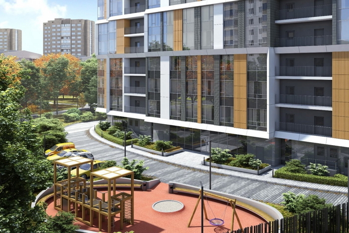 Первый этаж здания нежилой — он отведен под кафе и магазины. В закрытом дворе оборудуются спортивные и детские площадки, проводится обширное озеленение.