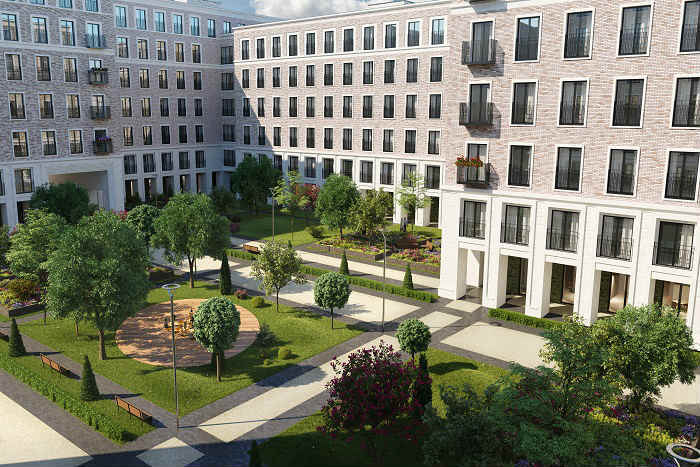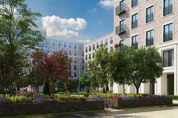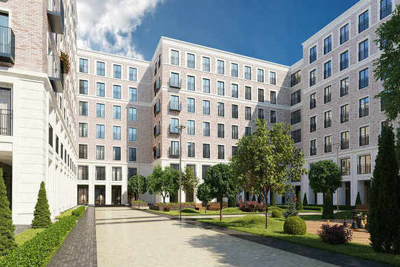 Архитектурная концепция жилого квартала премиум-класса принадлежит известному английскому бюро — в основе ее лежит строгий лаконичный стиль современных деловых кварталов Лондона.