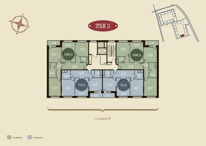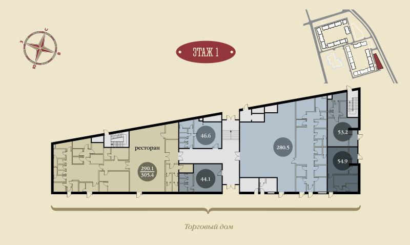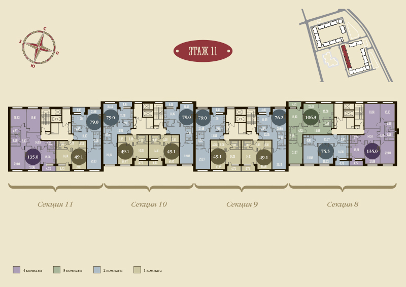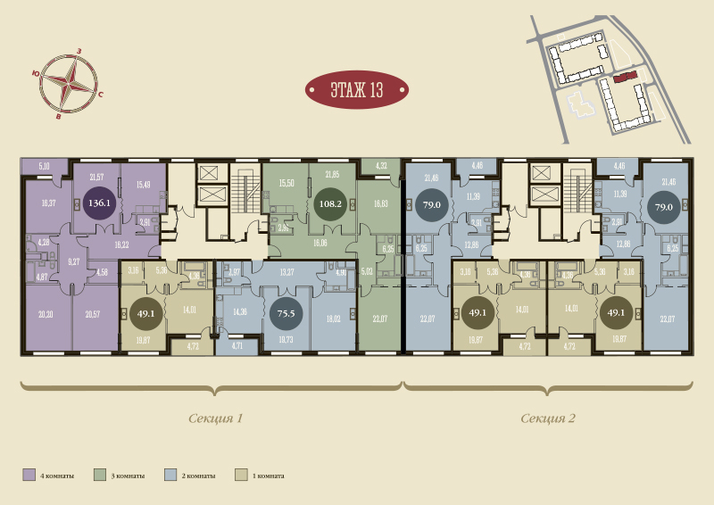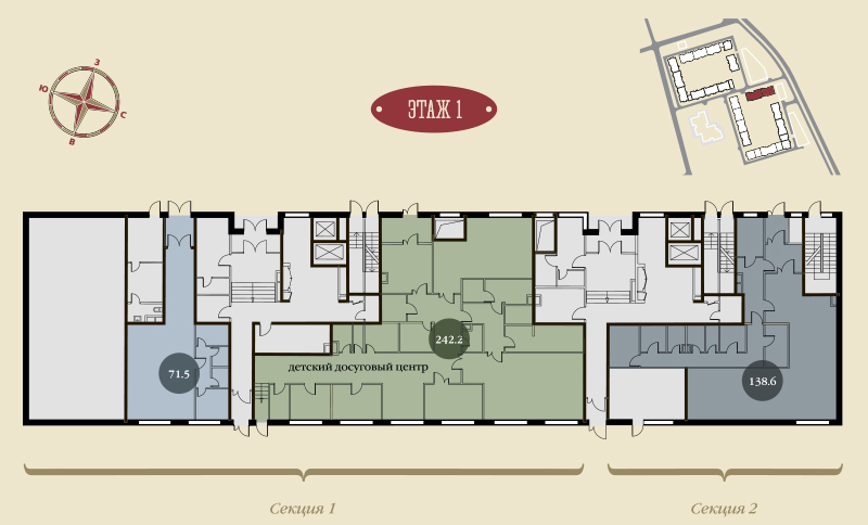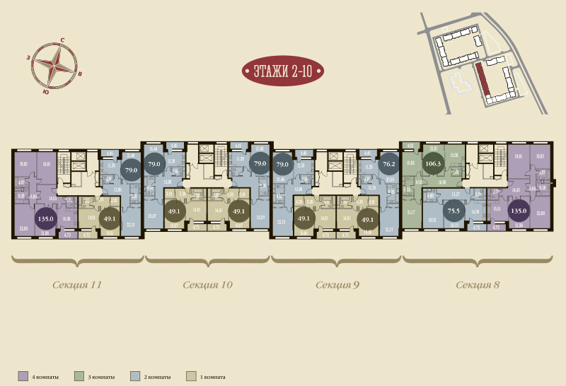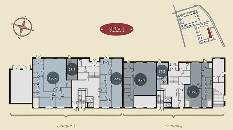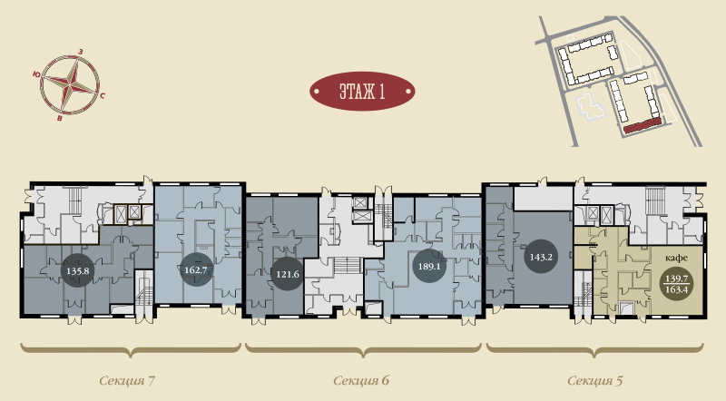 Комплекс премиум-класса включает два дома переменной этажности (11-13 этажей), образующих просторные внутренние дворы.